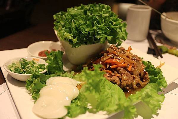 用生菜包上肉片、年糕,還有店家提供的小菜,像是泡菜、海苔、黃豆芽等等