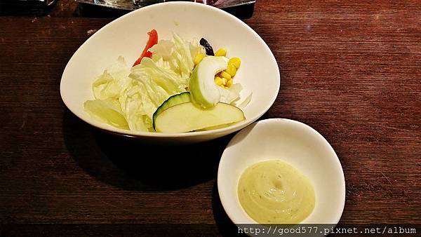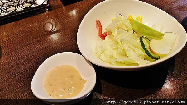 沙拉提供幾種醬做選擇,有千島醬、凱薩醬、和風醬等等
