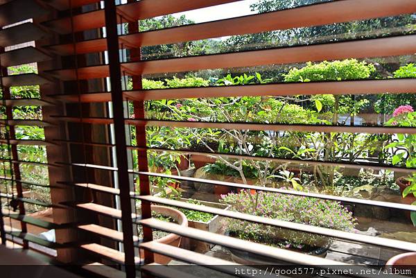 以百葉窗遮擋熾熱的強光,窗外陽台種滿許多盆栽