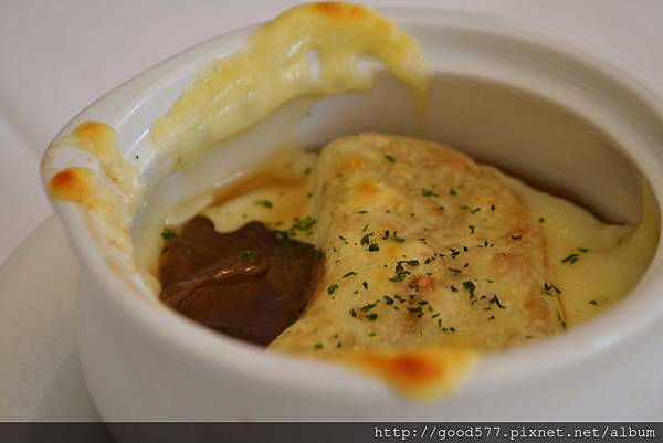 ▲焗烤起司的鹹和洋蔥的甜味融合,一個牽絲一個軟爛,口感豐富