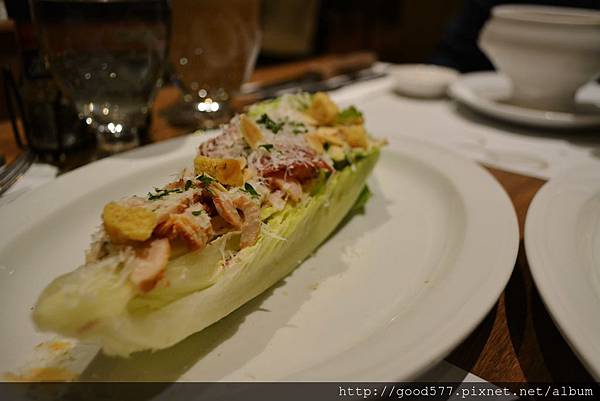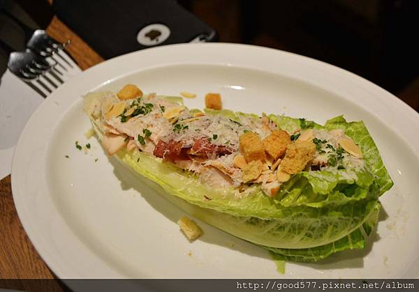 (它真的很難食用,因為用刀叉切,蘿蔓葉上面的餡料都會一直掉,