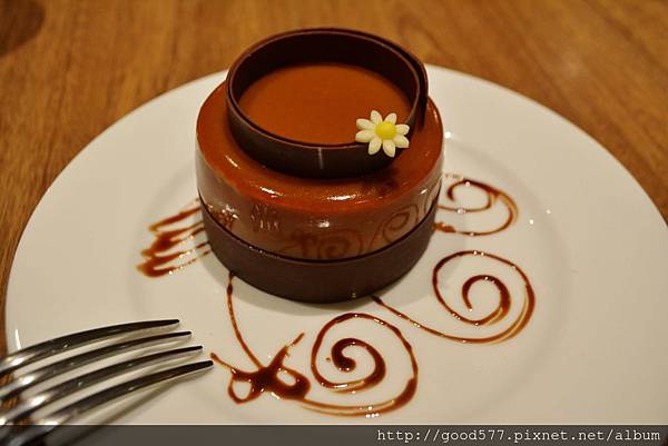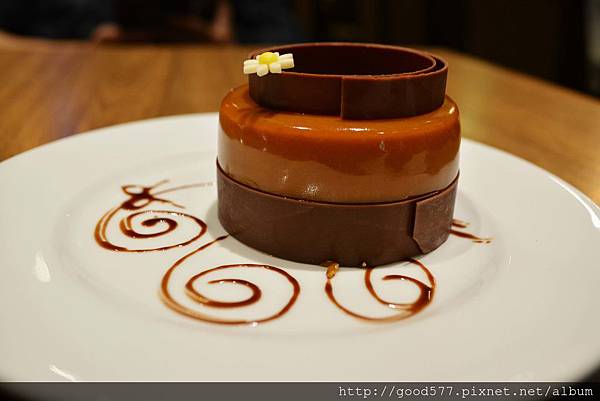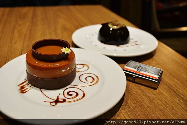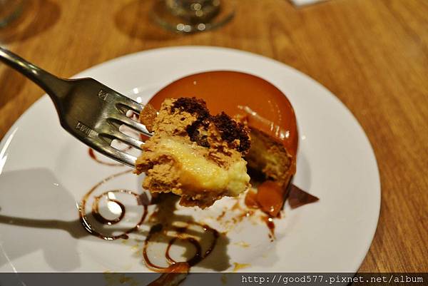 最外面是一層焦糖醬(但很像一層皮),內餡是巧克力蛋糕與香草慕斯