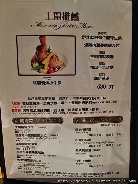 A套餐:主廚濃湯、主廚沙拉二選一;飲料則有咖啡/紅茶/果汁/奶茶