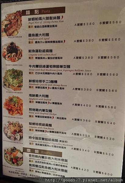有各類的排餐、開胃菜、義大利麵、燉飯、精緻甜點......等等